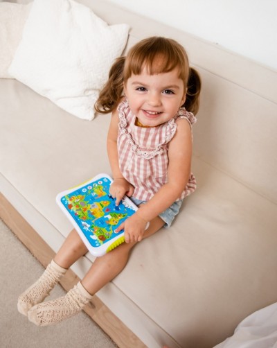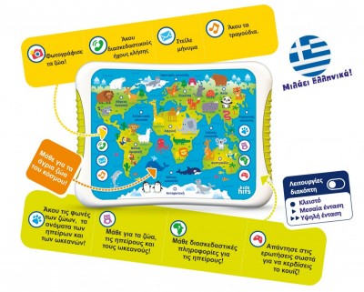 Το Tablet Άτλαντας είναι ένα εκπαιδευτικό διαδραστικό παιχνίδι που εισάγει το παιδί στον κόσμο της γνώσης! Με αυτό το πρωτότυπο παιχνίδι tablet το παιδί μαθαίνει ενδιαφέρουσες πληροφορίες για τα ζώα του κόσμου, τις ηπείρους και τους ωκεανούς. Ο πολύχρωμος σχεδιασμός, οι ήχοι ζώων και οι πρωτότυπες μελωδίες προσφέρουν ώρες ψυχαγωγίας, βοηθώντας στην ανάπτυξη των αισθητηριακών δεξιοτήτων και της λογικής. Το πρακτικό σχήμα και η ποικιλία εκπαιδευτικού περιεχομένου και κουίζ, κάνουν το Tablet Άτλαντα ένα από τα δημοφιλέστερα παιχνίδια!