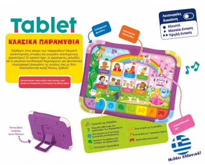 Ανακαλύψτε τις μοναδικές αφηγήσεις του Tablet Κλασικά Παραμύθια! Με αυτό το διαδραστικό παιχνιίδι το παιδί γνωρίζει τους χαρακτήρες κλασικών και αγαπημένων παραμυθιών και διασκεδάζει δοκιμάζοντας τις γνώσεις του μέσα από 2 έξυπνα κουίζ. Οι αφηγήσεις των παραμυθιών, τα λαμπερά φωτάκια και τα χαρούμενα τραγούδια στα Ελληνικά συνθέτουν ένα εκπαιδευτικό περιβάλλον που διατηρεί αμείωτο το ενδιαφέρον του παιδιού.