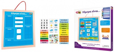 1 ξύλινος μαγνητικός πίνακας, 6 μαγνητάκια με καιρικά φαινόμενα, 4 μαγνητάκια με τις εποχές, 12 μαγνητάκια με αριθμούς, 12 μαγνητάκια με τους μήνες, 7 μαγνητάκια με τις ημέρες της εβδομάδας