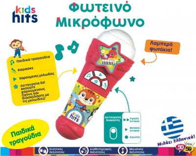 Με το Φωτεινό Μικρόφωνο Παιδικά Τραγούδια, το παιδί τραγουδάει καραόκε τα αγαπημένα του Eλληνικά παιδικά τραγούδια και δημιουργεί τις δικές του πρωτότυπες μουσικές συνθέσεις με τη λειτουργία Dj. Το Μικρόφωνο είναι εύκολο στο κράτημα λόγω του πρακτικού σχεδιασμού του. Τα πολύχρωμα κουμπάκια και τα χαρούμενα χρώματα διεγείρουν την οπτική ικανότητα του παιδιού. Τα εντυπωσιακά φωτάκια, οι χαρούμενες μελωδίες και οι ακαταμάχητοι μουσικοί ρυθμοί δημιουργούν το ιδανικό σκηνικό για μια εντυπωσιακή μουσική παράσταση! Διατίθεται σε μπλε και κόκκινο χρώμα.