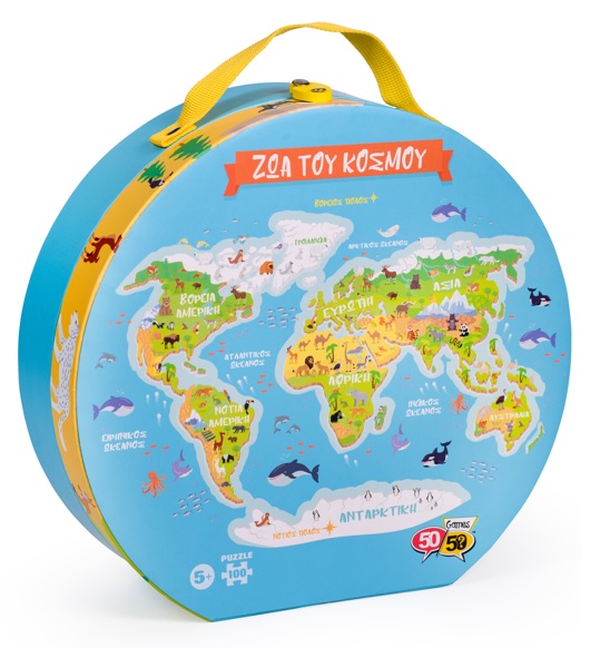 Ένα πρωτότυπο παζλ χάρτης που απεικονίζει τα ζώα ολόκληρου του κόσμου. Από τη Βόρεια Αμερική μέχρι την παγωμένη Ανταρκτική θα δεις και θα γνωρίζεις τα ζώα που κατοικούν στα πέρατα της γης συναρμολογώντας αυτό το παζλ 100 κομματιών της σειράς «50/50 GAMES».