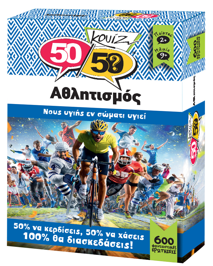 Η πεταλούδα είναι τεχνική κολύμβησης ή στίβου; Από πού προέρχεται η φράση «Έγινε Λούης»; Στο άλμα εις ύψος ή στο άλμα επί κοντώ χρησιμοποιείται κοντάρι; Τέσταρε τις γνώσεις σου και συναγωνίσου τους φίλους σου με το νέο επιτραπέζιο ερωτήσεων 50-50 Κουίζ Αθλητισμός! Με 600 ερωτήσεις που καλύπτουν ποικίλα θέματα, μαθαίνεις τις πιο ενδιαφέρουσες και αξιοπερίεργες πληροφορίες.